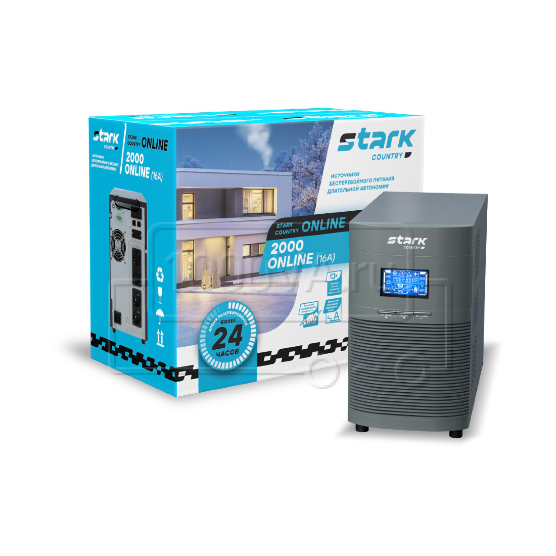 Stark Country 2000 ONLINE (16A) — онлайн ИБП двойного преобразования с постоянной стабилизацией напряжения. Любые отклонения напряжения фиксируются интегрированным микропроцессором, благодаря чему достигается высокая точность постоянной стабилизации напряжения. Устройство имеет высокий коэффициент мощности и КПД, умное ЗУ с широким диапазоном зарядного тока, большой информационный дисплей с возможностью настраивать параметры, возможность удаленного мониторинга и оповещения, а также возможность резервирования нагрузки более 24 часов. Для работы нужно подключить 4 внешних аккумулятора. Отличительной особенностью ИБП является малошумность.