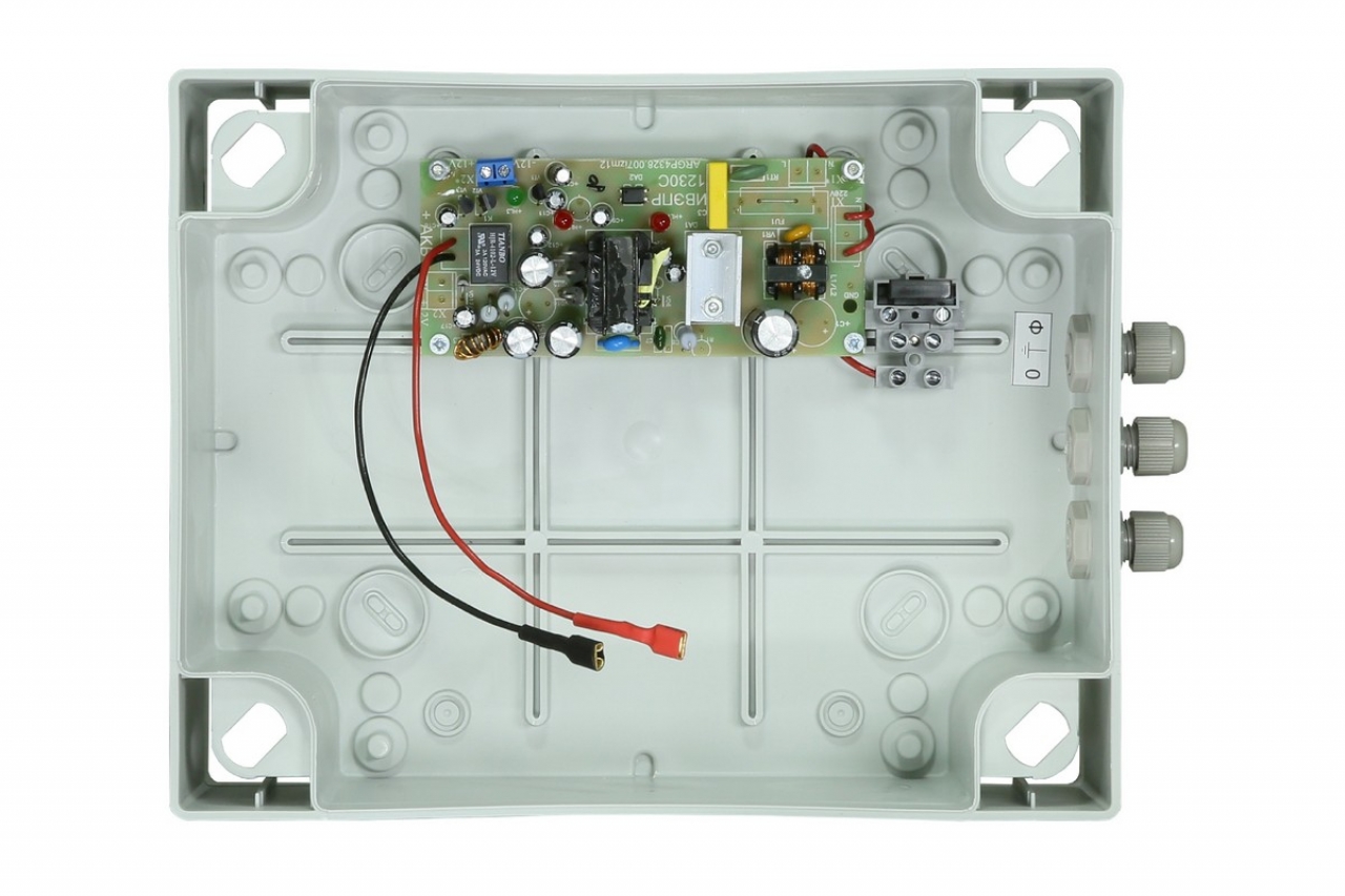 Уличное исполнение. Герметичный пластиковый корпус. U=13.5B, Iном=3А, Iмакс.=3,5А, АКБ 7А/ч. Размер 255х200х100 мм