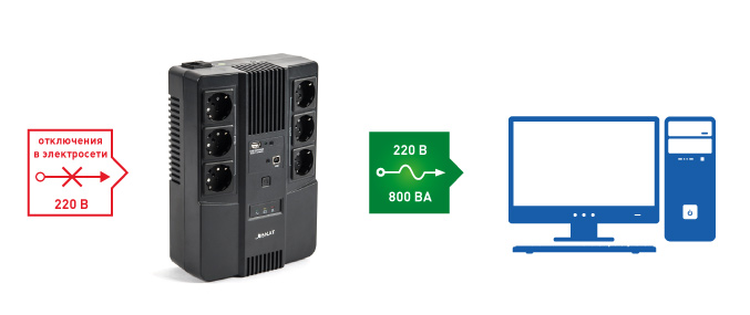 - питание персонального компьютера, а также питание периферийного оборудования (принтер, сканер, факс, колонки и т.п.) в режиме ОСНОВНОЙ;