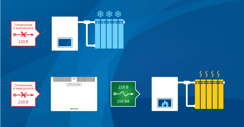 220 В, 250 ВА (200 Вт). Чистый синус. Автоматический переход на резервное питание от АКБ при пропадании сети. Металло-пластиковый корпус, встроенная АКБ 40Ач. Защита АКБ от глубокого разряда, оптимальный заряд АКБ, модуль зануления для корректной работы котла в режиме резерва, защита от перегрузки, индикация режимов работы, настенная или настольная установка. Режим продления времени резерва.
