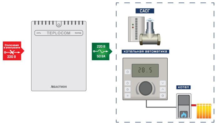 Автоматический переход на резервное питание от АКБ при пропадании сети. Пластиковый корпус рассчитан под установку АКБ 7 Ач. Возможность подключения внешней аккумуляторной батареи ёмкостью до 26 Ач. Защита АКБ от глубокого разряда, оптимальный заряд АКБ, защита от перегрузки, индикация режимов работы, настенная установка. Разработан с учётом специфики работы котельной автоматики.