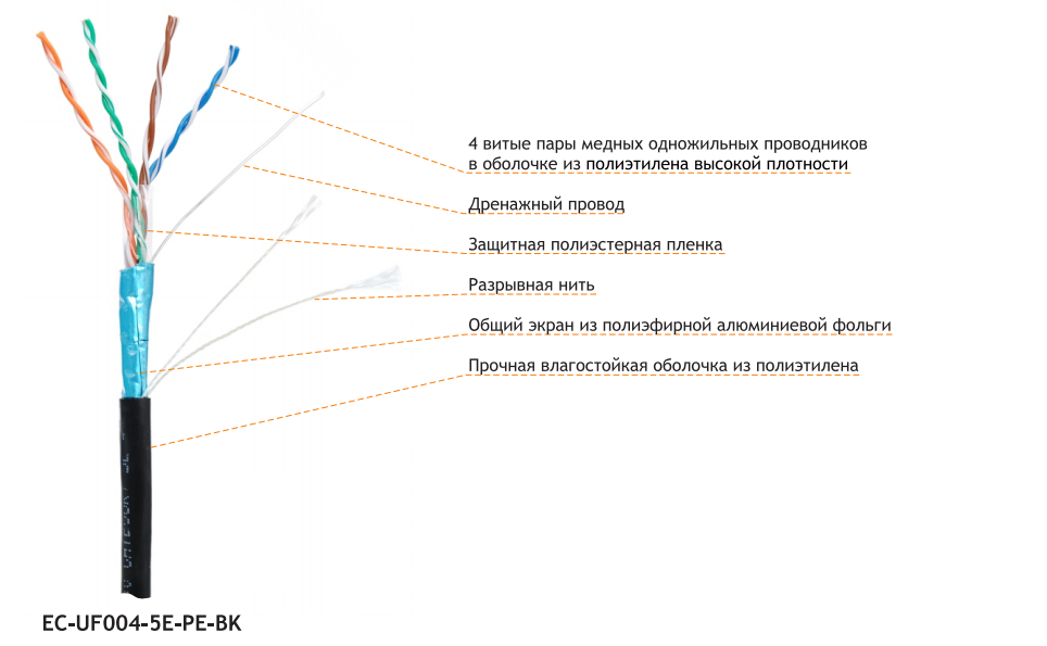 Кабель EC-UF004-5E-PE-BK содержит 4 пары витых медных проводников, выполнен в экранированном исполнении, соответствует категории 5e и предназначен для внешней прокладки. Поставляется в картонных коробках, по 305 м. Для удобства транспортировки и лучшей сохранности, две коробки с кабелем дополнительно объединены в одну общую транспортную картонную коробку.
