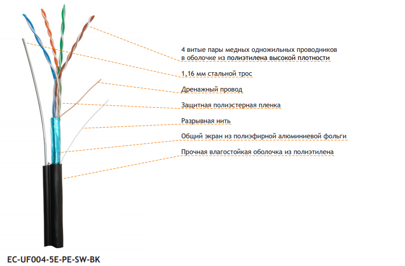 Кабель EC-UF004-5E-PE-SW-BK выполнен в экранированном исполнении, соответствует категории 5e и предназначен для подвеса между зданиями и сооружениями, а также – на опорах воздушных линий связи. Поставляется на фанерных барабанах в картонных коробках, по 305м.
