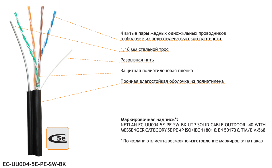 Кабель EC-UU004-5E-PE-SW-BK выполнен в неэкранированном исполнении, соответствует категории 5e и предназначен для подвеса между зданиями и сооружениями, а также – на опорах воздушных линий связи. Поставляется на фанерных барабанах в картонных коробках, по 305 м.