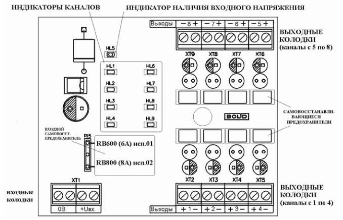 - Индикация перегрузок по току (красные индикаторы «1»-«8»)