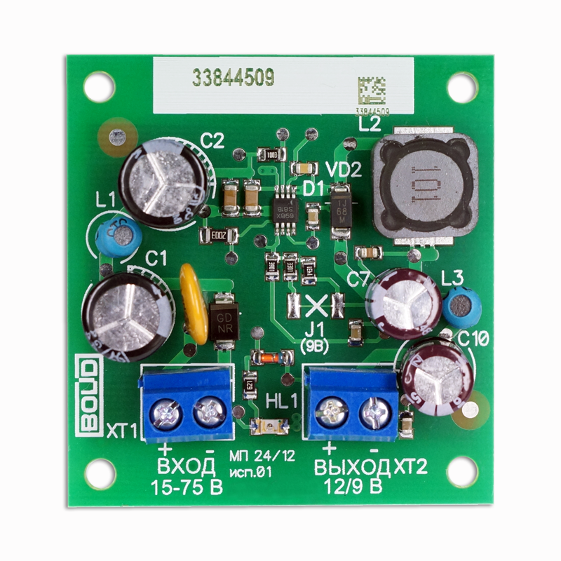 Модуль преобразователя напряжения для питания удаленных нагрузок. Входное напряжение от 15 до 75В, выходное 12В или 9,3В, выходной ток – 0,5 А.  От минус 40 до +50°С