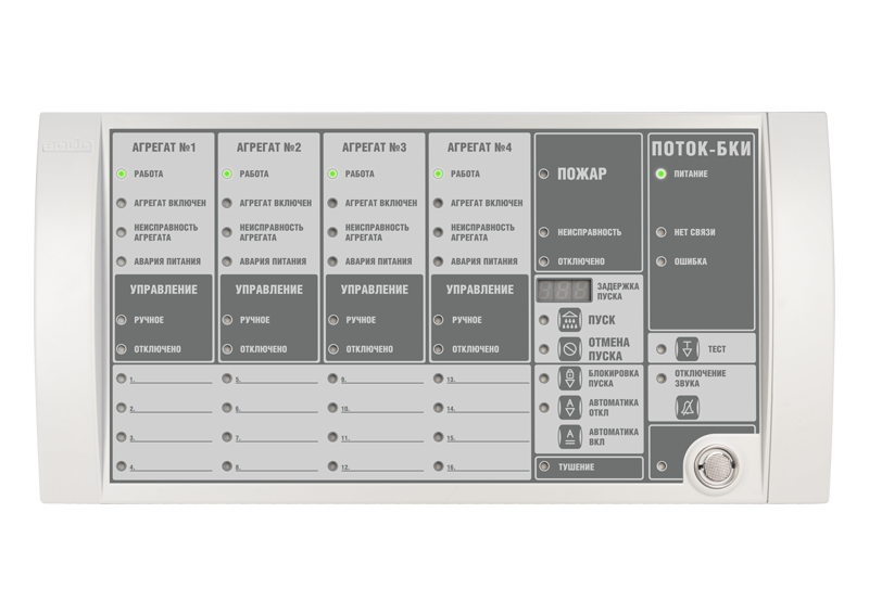 Предназначен для работы в составе оборудования насосной станции или станции спринклерного, дренчерного, пенного пожаротушения или пожарного водопровода. Работа блока возможна только совместно с сетевым контроллером (пультом "С2000М" в.3.03 и выше). Обеспечивает световую и звуковую индикацию состояния станции пожаротушения, выполненной на основе блока "Поток-3Н" и дистанционное управление этим блоком. Позволяет отображать состояние пожарных разделов, входов запуска пожаротушения, датчиков выхода на режим, датчиков управления жокей–насосом, датчиков аварийных уровней, концевых выключателей задвижек и т.д. на 16 индикаторах.