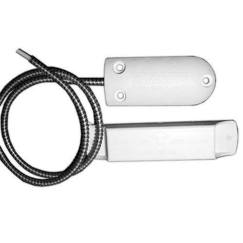 Магнитоконтактный для металлических поверхностей; контакты размыкаются при тревоге, 25 мм (контакты замкнуты), 70 мм (контакты разомкнуты); U-коммут.72 В, I-коммут.500 мА, P-коммут.10 Вт; IP55, t-раб.-50…+50°С, 90х40х10.4 мм (геркон), 130х30х20 мм (магнит). Кабель КСПВГ 2x0,2 в металлорукаве 6.2 мм 700 мм . Пластиковый корпус. 0.25 кг.
