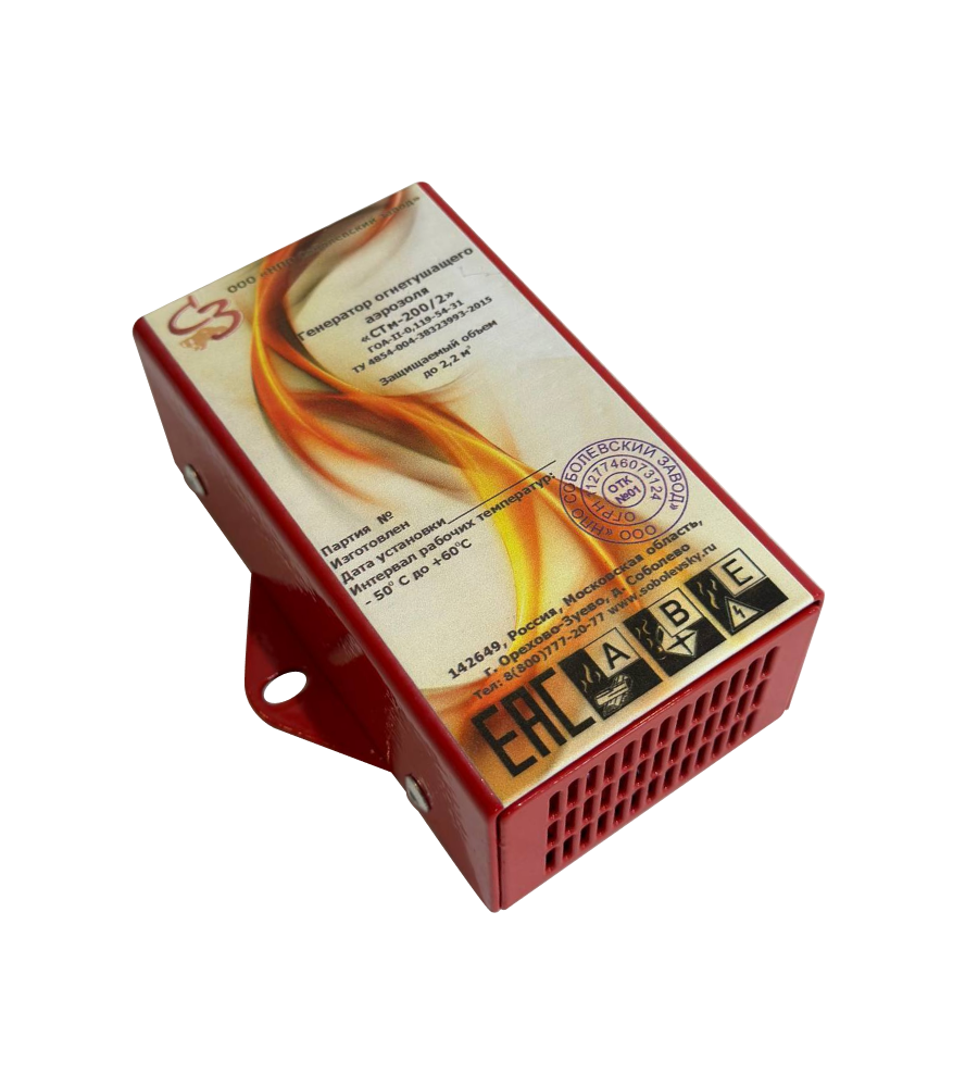 Автономный автоматический модуль аэрозольного пожаротушения «СТм, СТт» предназначен для локализации и ликвидации пожаров на начальных стадиях развития в условно-герметичном объеме: электрошкафах, распределительных устройствах электросетей и связи, радиорелейных и телефонных ретрансляторах, закрытых двигательных отсеках и грузовых отделениях транспортных средств и т.п.