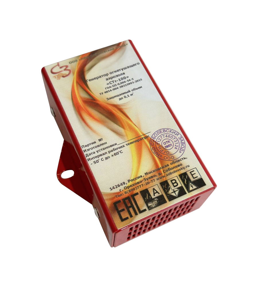Автономный автоматический модуль аэрозольного пожаротушения «СТм, СТт» предназначен для локализации и ликвидации пожаров на начальных стадиях развития в условно-герметичном объеме: электрошкафах, распределительных устройствах электросетей и связи, радиорелейных и телефонных ретрансляторах, закрытых двигательных отсеках и грузовых отделениях транспортных средств и т.п.