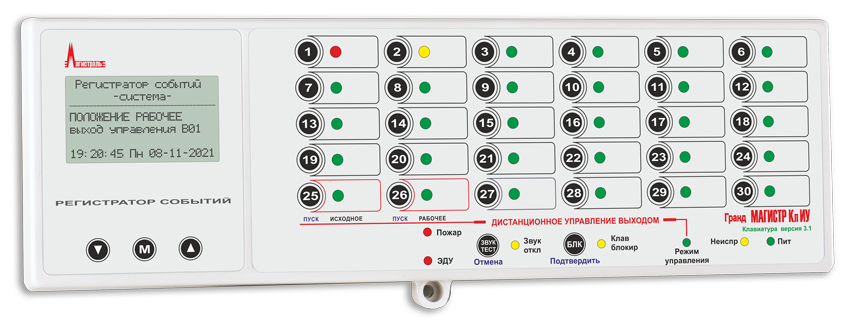 Предназначена для контроля и управления состоянием клапанов дымоудаления или огнезадерживающих клапанов и других исполнительных устройств, подключенных к выходам управления блоков ключей Гранд МАГИСТР БК-1 или Гранд МАГИСТР БК-2. Позволяет контролировать до 30 выходов управления в одном приборе с возможностью ручного дистанционного переключения исполнительных устройств в рабочее и исходное состояние, с отображением положения клапана, текущего состояния выхода с регистрацией событий, и отображением информации на ЖК-дисплее. Клавиатура управления является дополнительным функциональным блоком для работы в приборах ППКОП Гранд МАГИСТР (версия 3.1), ППКУП Гранд МАГИСТР ПУ (версия 3.1), ППКУОП Гранд МАГИСТР-125 (версия 3.1), ППКУОП Магистратор (версия 3.1).Характеристики Магистраль Гранд МАГИСТР Кл ИУ (версия 3.1):