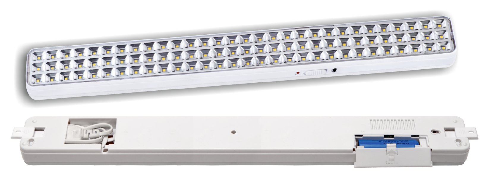 Светильник аварийного освещения светодиодный с выбором режима свечения: постоянный или непостоянный; 90 светодиодов, световой поток 550 Лм; U-пит.187...242В, 2 Li-ion аккумулятор 3.7 В, 2000 мАч (основной и сменный), время свечения - до 4 часов; t-раб.0...+40°С, 480х55х30 мм, 0.36 кг