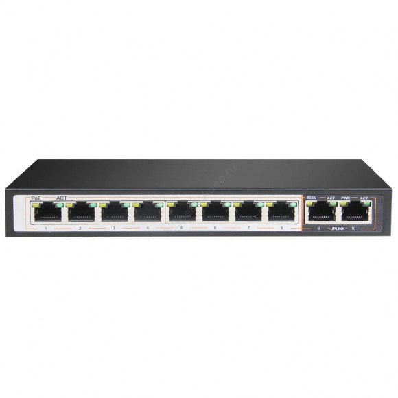 8 портов x10/100 Base-TX (Питание PoE), 2 порта x10/100 Base-TX (Uplink); IEEE802.3af/IEEE802.3at; Коммутационная способность: 2 Гбит/с. Режимы: VLAN, CCTV, AI-POE(watchdog), QoS