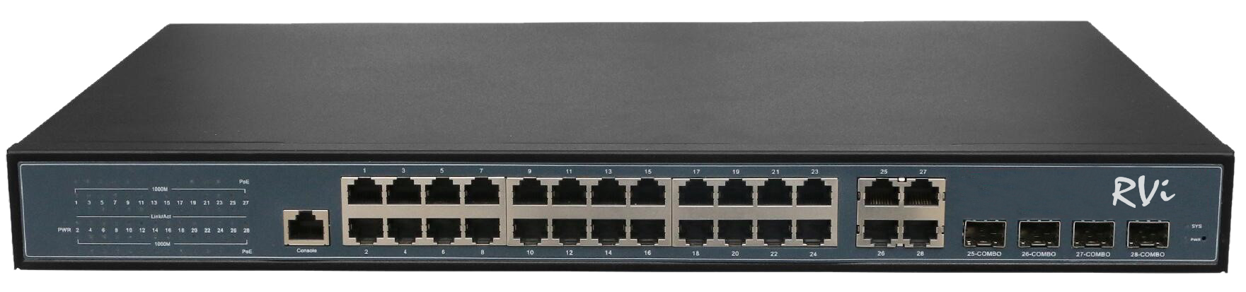 Коммутатор RVi-1NSM24G-4C имеет 32 порта (из них 24 - PoE) с максимальной дальностью передачи сигнала до 100 м.