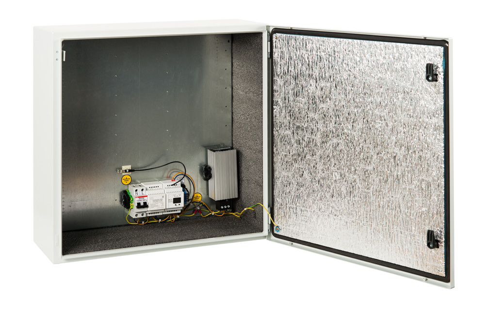 Металлический утепленный уличный корпус 600х600х250мм с классом защиты IP65. Температурный диапазон -45С - +50С. Встроенный УЗИП II класса. Двухполюсный автоматический выключатель для защиты от КЗ и перегрузки . Встроенный цифровой контроллер ЦКТ-01 для управления климатом и защиты оборудования. Высокая точность поддержания температуры благодаря использованию цифрового термодатчика DS18B20. Защита от холодного пуска и перегрева оборудования. Настройка поддерживаемой температуры, а также температуры защиты от холодного пуска. Нагреватель мощностью 100Вт. Информирование типа ""сухой контакт"" при авариях или вскрытии шкафа. Гарантия 5 лет.