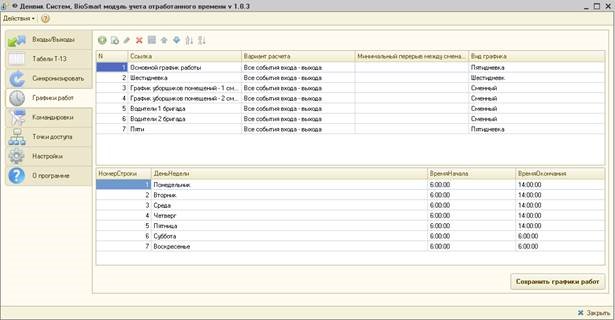 -учет различных вариантов расчетов табеля для разных графиков работы (все входы-выходы, первый вход-последний выход);