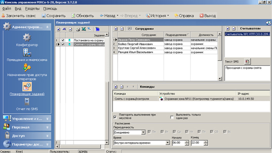 Раздел «Планировщик заданий» - задание последовательности команд управления устройствами контроля доступа, выполняемых Сервером системы, отправка SMS-сообщений и дисциплинарных отчетов по E-mail в рамках выполнения задания.