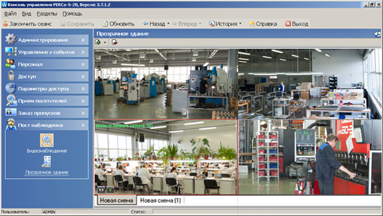 Модуль «Прозрачное здание» позволяет не только просматривать видеоизображение, получаемое в данный момент с видеокамер, но также позволяет просмотреть записанную ранее видеоинформацию. Глубина записи видеоинформации зависит от размера видеоархива, который задается при конфигурации системы видеонаблюдения в настройках Сервера видеонаблюдения.