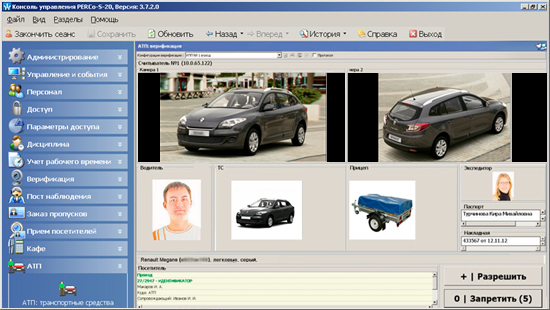 Дополнительно к стандартной для системы контроля доступа (СКУД) возможности верификации, модуль ПО «АТП» позволяет организовать контроль доступа ТС на территорию с досмотром охранником. При этом данные охранника, проводившего досмотр ТС, фиксируются в программе.