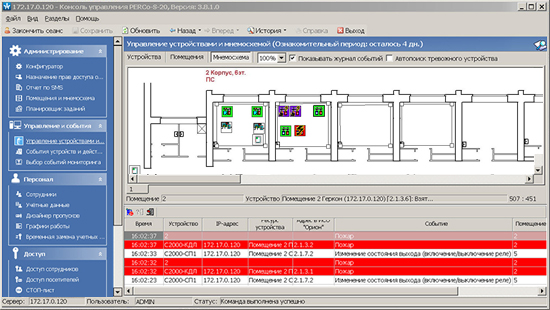 -PERCo-SM08 «Мониторинг» или PERCo-SM13 «Центральный пост» - для непрерывного контроля охранно-пожарной обстановки с ее визуализацией на мониторе сотрудника безопасности и оперативного реагирования на нештатные ситуации.