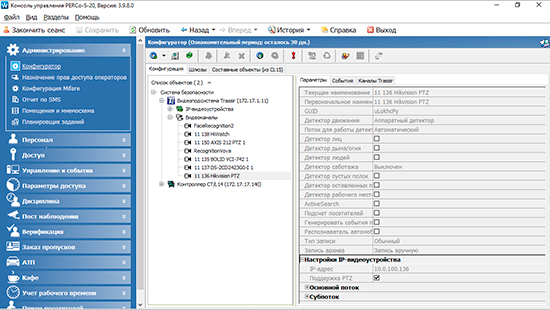 - Вывод видео с камер Trassir в интерфейсе системы PERCo-S-20.