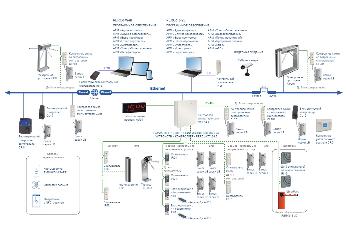 - два встроенных универсальных считывателя (EMM/HID/MIFARE)