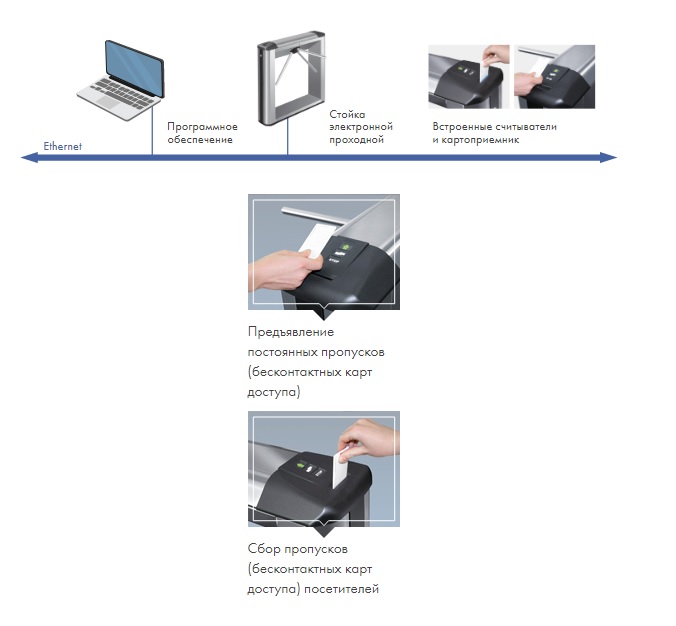 - работа с картами формата EMM/HID/MIFARE, смартфонами с NFC-модулем и - банковскими картами с технологией PayPass.