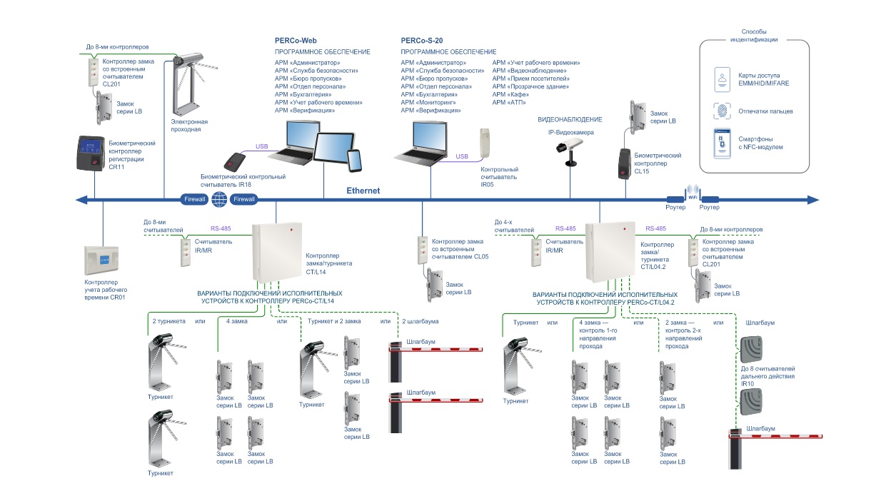 - два встроенных считывателя бесконтактных карт доступа (EMM/HID/MIFARE);
