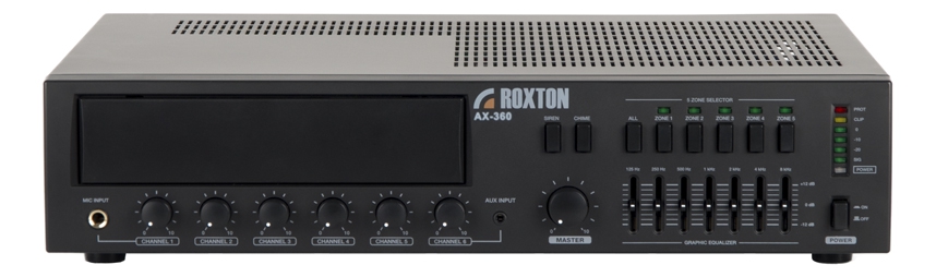 Зональный усилитель класса D ROXTON AX-360 мощностью 360 Вт позволяет строить распределённые системы речевого оповещения и музыкальной трансляции. В первую очередь он предназначен для озвучивания помещений. Пять линейных и семь микрофонных аудиовходов, с индивидуальными регуляторами громкости, фантомным питанием и тремя уровнями приоритетов, дают широкий выбор источников аудиосигнала, а дополнительный низкоомный аудиовыход позволяет подключать к усилителю акустические системы бытового и профессионального уровней. Встроенный селектор зон, коммутирующий высоковольтные выходы усилителя с пятью линиями громкоговорителей даёт возможность выбора, в какие зоны транслировать аудиосигнал. Помимо этого, ROXTON AX-360 оборудован 7-ми полосным графический эквалайзером выходного аудиосигнала позволяющего получать требуемую выразительность и громкость звучания транслируемой музыки и речи. Применение усилителя класса D и импульсный блок питания позволили добиться снижения веса усилителя и уменьшения потребляемой энергии без потери качества транслируемого звука. Сочетание огромного количества функций, простоты использования и надёжности сделали ROXTON AX-360 незаменимым при озвучивании кафе, баров, ресторанов, административных и офисных помещений.