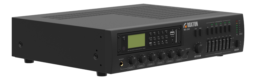 Встроенный селектор зон, коммутирующий высоковольтные выходы усилителя с пятью линиями громкоговорителей даёт возможность выбора, в какие зоны транслировать аудиосигнал. Помимо этого, ROXTON MX-240 оборудован 7-ми полосным графический эквалайзером выходного аудиосигнала позволяющего получать требуемую выразительность и громкость звучания транслируемой музыки и речи. Применение усилителя класса D и импульсный блок питания позволили добиться снижения веса усилителя и уменьшения потребляемой энергии без потери качества транслируемого звука. Сочетание огромного количества функций, простоты использования и надёжности сделали ROXTON MX-240 незаменимым при озвучивании кафе, баров, ресторанов, административных и офисных помещений.