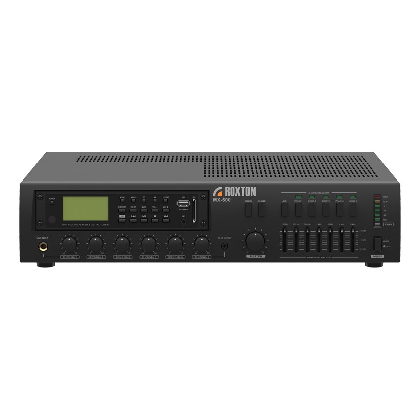 Настольный микшер-усилитель MX-600 ROXTON, мощность 600 Вт, выходное напряжение 100В, предусмотрен общий низкоомный выход 4 Ом. Усилитель имеет селектор на 5 зон трансляции, встроенный АМ/FM тюнер с памятью станций, USB/MP3 проигрыватель, также предусмотрен слот для SD карт. Выбор зон осуществляется на передней панели усилителя или, при объявлений с микрофонной консоли RM-05, непосредственно на микрофоне. Для получения оптимальных частотных характеристик в усилителе предусмотрен семи-полосный эквалайзер. Встроенные генераторы предупреждающего сигнала "Гонг" (запускается с усилителя или с микрофонной панели RM-05) и "Сирена" (запускается только кнопкой на передней панели усилителя).