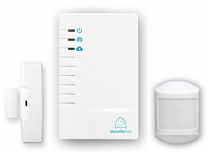 - комплект состоит из абонентского контроллера Security Hub (SH) с аккумуляторной батареей, сетевого адаптера с кабелем USB, радиодатчиков движения и открытия двери/окна с элементами питания. Функционал комплекта расширяется беспроводными датчиками разбития стекла, протечки воды, задымления и др.;