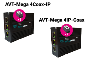 Комплекты AVT-Mega 4IP-Coax и AVT-Mega 4Coax-IP обеспечивают пассивную передачу IP видеосигналов по коаксиальному кабелю и активную передачу по кабелю UTP 5e/6 на общее расстояние до 400 метров.
